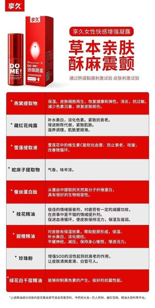 使用说明:前戏时使用: 取2-3滴本品,轻柔涂抹在女性阴蒂或其他私密部位,轻轻按摩以刺激敏感区域,帮助增强私处的敏感度,带来如“酥麻震动”般的愉悦感受,促进兴奋荷尔蒙的自然分泌,唤醒深层欲望。